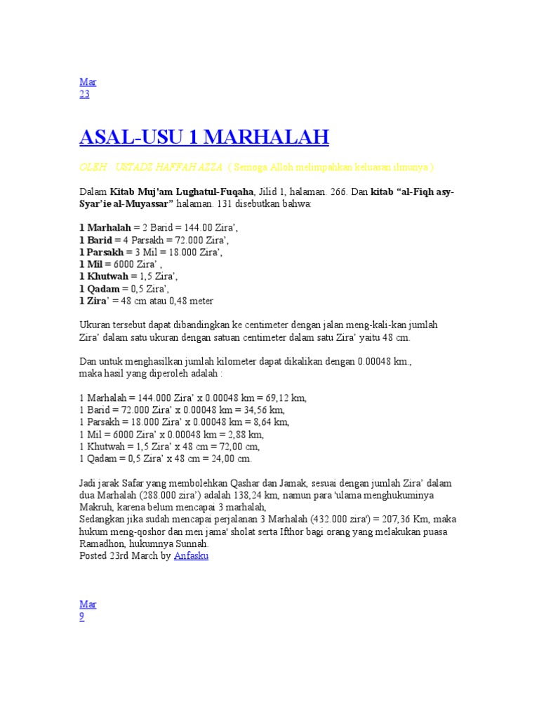 Konsepsi ukuran panjang jarak dalam hukum syar i. 7173 hits assalamualaikum dan selamat sejahtera semua seperti yang kita tahu antara syarat untuk jamak qasar semasa bermusafir adalah jarak antara rumah kita dan destinasi musafir tersebut mestilah lebih dari 2 marhalah kalau kurang dari 2 marhalah t. Unit lain dalam pengiraan marhalah ialah farsakh barid mil dan dziraa. 1 dzira 24 jari 6 qabdhah jengkal 1 mil 4000 dzira hasta 1 farsakh 3 mil 1 barid 4 farsakh 1 marhalah 4 barid jadi kalau 2 marhalah.