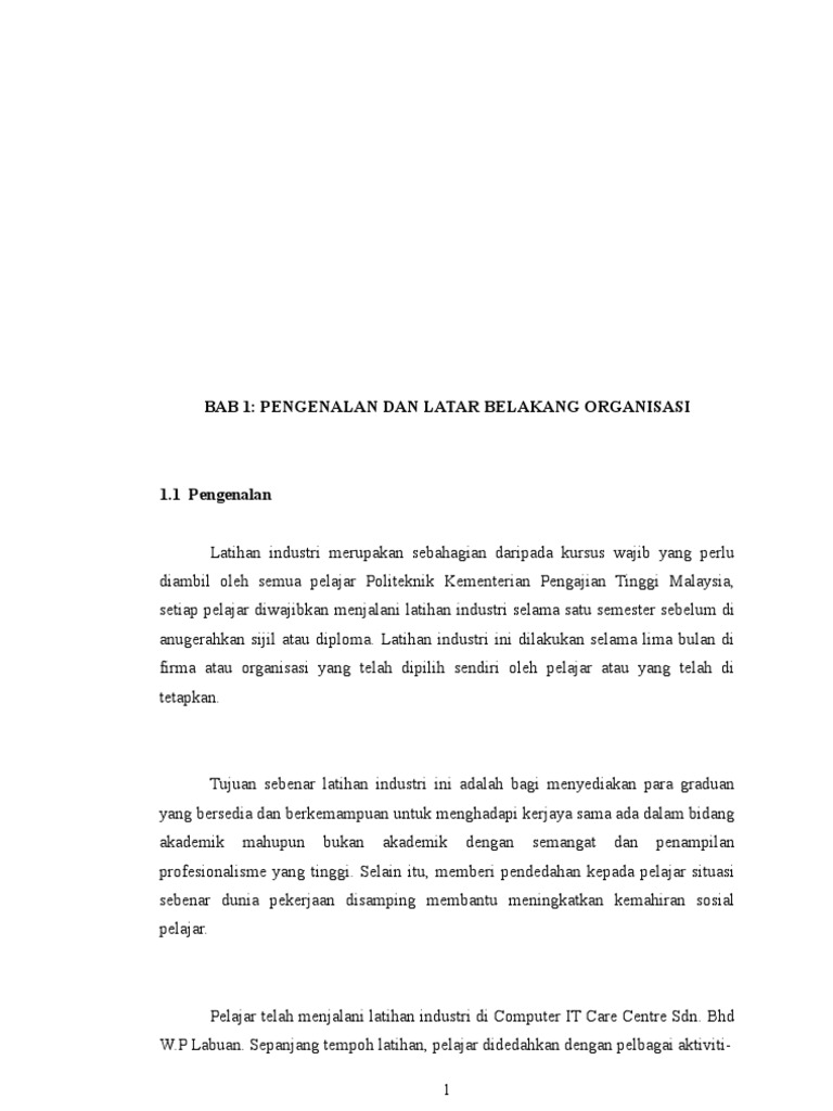 Contoh laporan latihan industri kolej komuniti dan politeknik fotografi dan iklan tips berpantang selepas keguguran atau bleeding. Musim cuti ni aku kena siapkan buku laporan untuk latihan industri aku buat masa ini hampir 80 siap cuma tinggal bab 2 saja lagi iaitu tentang laporan harian tadi aku dah siapkan laporan untuk 4 minggu pertama aku menjalani latihan jadi hari ini aku ingin kongsikan apa yang aku buat semasa menjalani latihan industri untuk bulan pertama. Bhd 26690 pekan pahang darul makmur. Secara kesimpulannya objektif dan latihan industri memainkan peranan yang penting bagi melahirkan pelajar yang memahami bidang tugasnya dan kerjaya yang bakal ditempuhi apabila tamat pengajian nanti.