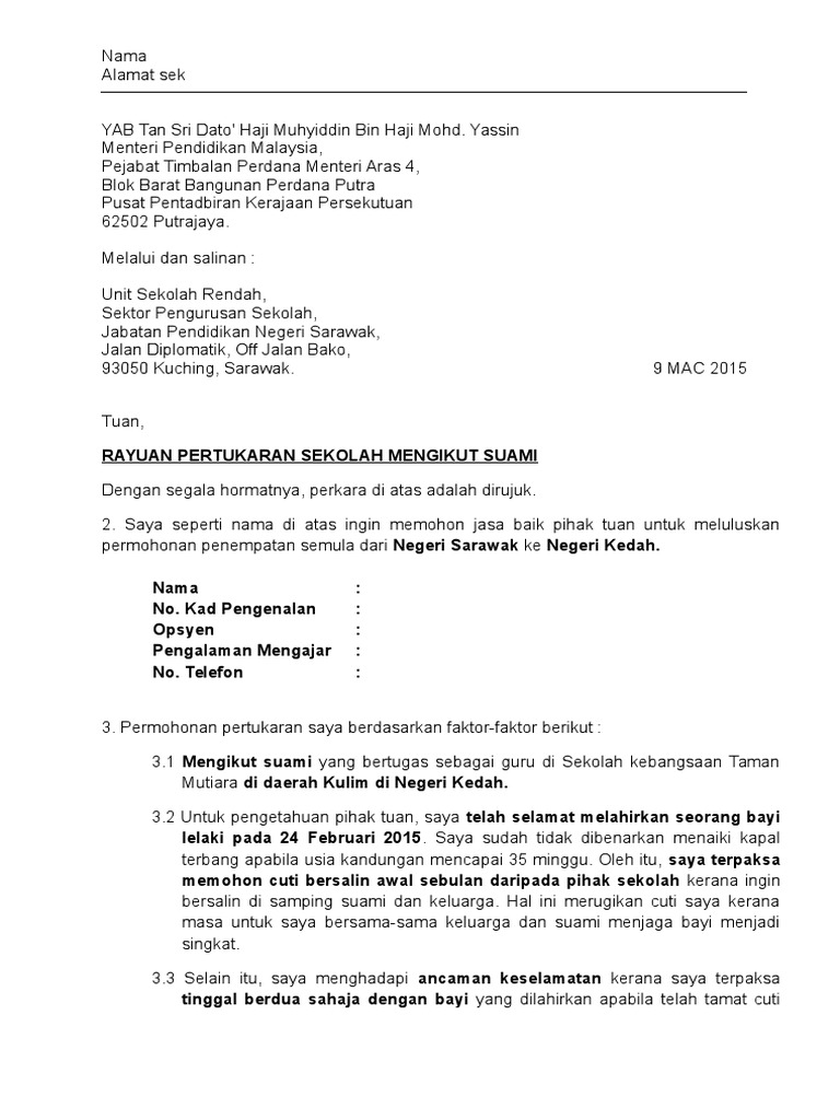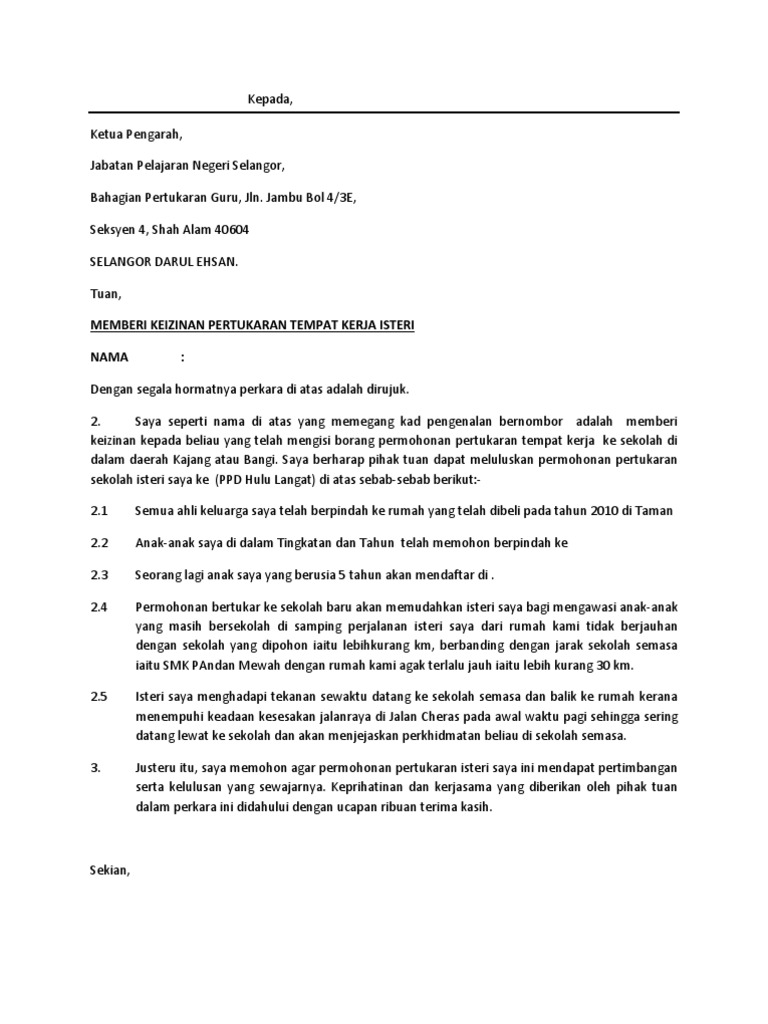 Alasan pertukaran tempat kerja mengikut suami. Surat izin suami mungkin dah terlambat untuk cn berkongsi dengan rakan rakan guru yang memohon pertukaran guru 2014 bulan september. Assalamualaikum mohon bantuan sy pelukan contoh surat pertukaran tempat bertugas dari penang ke kedah. Related posts to surat rasmi permohonan pertukaran tempat kerja surat rasmi permohonan pertukaran tempat kerja 2018 04 09t15 52 00 07 00 rating. Related posts to contoh surat rayuan pertukaran jururawat mengikut suami contoh surat rayuan pertukaran jururawat mengikut suami 2019 08 31t11 03 00 07 00 rating.