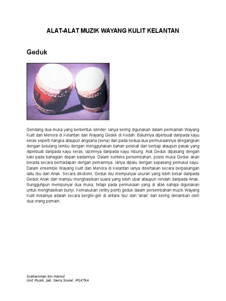 Alat muzik wayang kulit kelantan. Digunakan dalam ensemble paluan tradisional pada mulanya berkembang di negeri kelantan seperti wayang kulit mak yong dan menora serta ensemble paluan untuk mengiringi tarian tradisional seperti asyik dan wau bulan suara yang dapat dihasilkan oleh alat ini adalah gemersik dan memecah. Umpamanya patung wayang kelantan berbentuk sudut pandangan tepu sementara hampir kesemua patung wayang gedek dibentuk dari sudut pandangan hadapan. Wayang kulit kelantan 1. Untuk menghasilkan bunyi alat alat tersebut dilagakan dengan menggunakan kaedah hentakan.