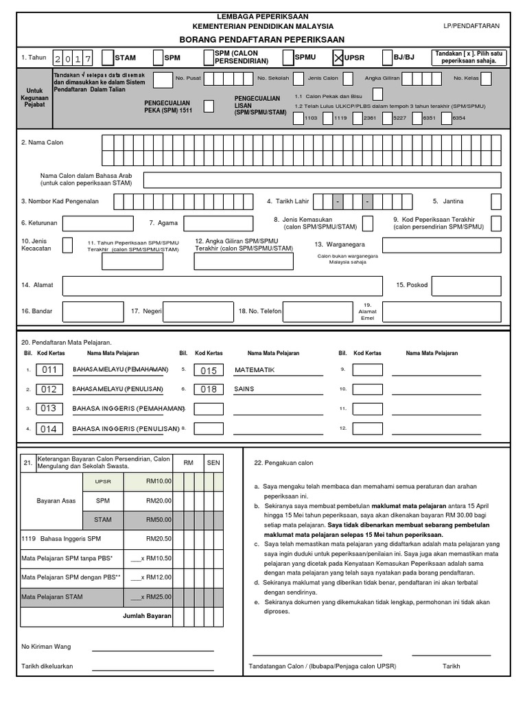 Tatacara syarat dan tarikh pendaftaran peperiksaan awam 2017 pihak lembaga telah menetapkan bahawa pendaftaran bagi peperiksaan awam untuk sesi 2017 adalah bermula 1 mac 2017. Xls borang pendaftaran upsr 2016 sjkt ladang. Borang hendaklah diisi dengan tulisan tangan calon sendiri menggunakan pena mata bola sahaja. Lp pendaftaran 1103 1119 6354 jenis calon kementerian pendidikan malaysia no.