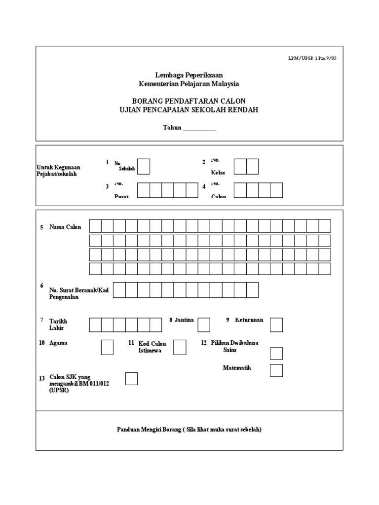Borang pendaftaran calon pt3 3. Borang pendaftaran calon sekolah spm 4. Borang pendaftaran calon upsr 2. Calon hendaklah membaca semua arahan dengan teliti sebelum mengisi borang pendaftaran peperiksaan upsr.
