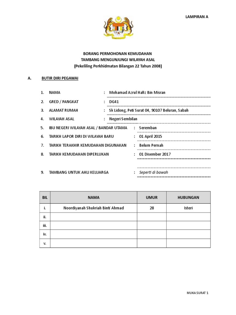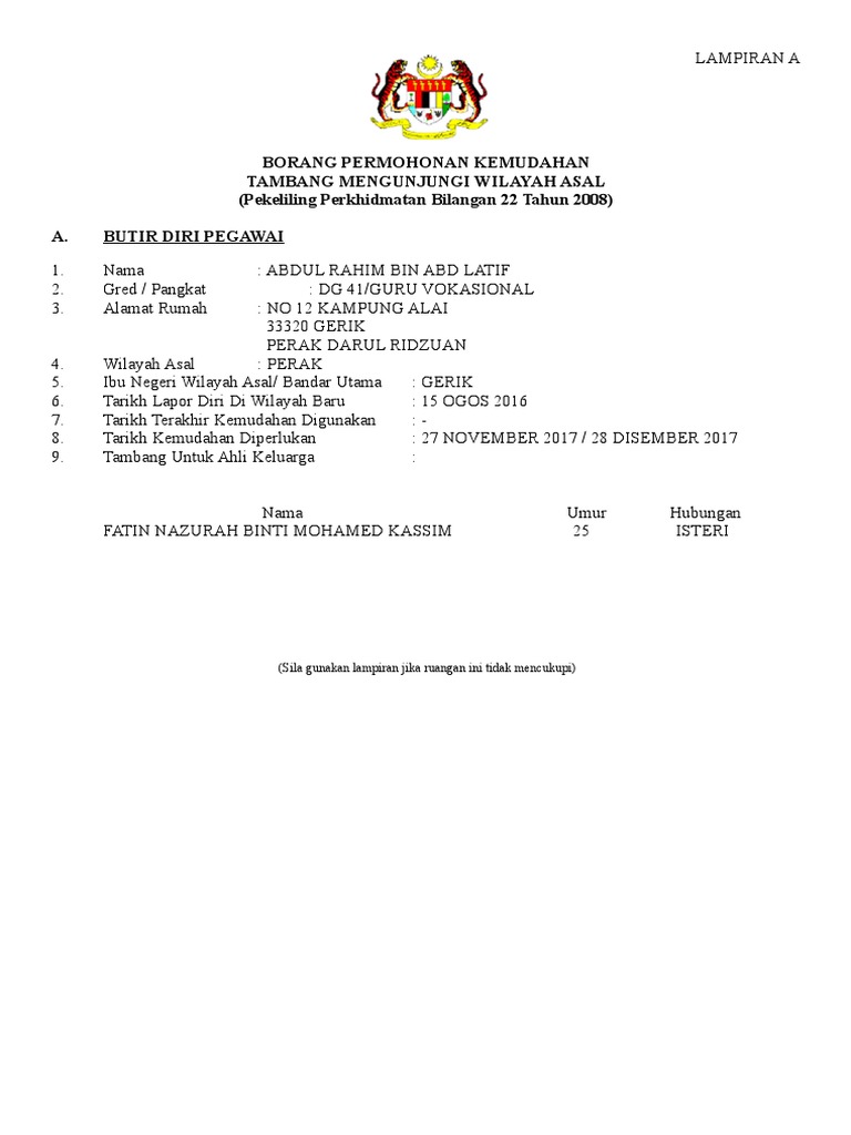 Ii diri dan isteri suami anak ke ibu negeri wilayah asal bandar utama. Kadar bujang kadar keluarga sila potong yang tidak berkenaan a. Borang kemas kini ogos 2017 1 borang permohonan kemudahan tambang mengunjungi wilayah asal pekeliling perkhidmatan bilangan 22 tahun 2008 a. Permohonan pegawai sila tandakan di ruangan yang berkaitan saya memohon menggunakan kemudahan tambang mengunjungi wilayah asal untuk.