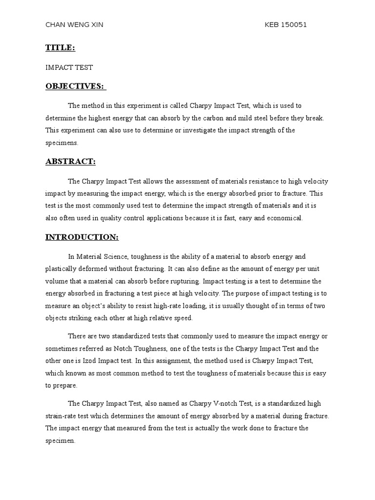 Charpy impact test lab report abstract. Ductile materials tend to have a higher impact energy than brittle materials. Abstract in this experiment we are using four different materials to doing charpy impact test which were acrylic drylin aluminum and steel in this experiment we were using different hammer weights for different specimen to observe the breaking point the temperature was kept constant during the experiment at room temperature. Abstract in this lab we performed a charpy impact test on three different types of steels hot rolled c1018 cold finished c4140. Impact and hardness testing me 3701 02 3rd march 2009 ke chen abstract this experiment as may be derived from the title involves testing multiple metallic specimens to determine their toughness strength and hardness.