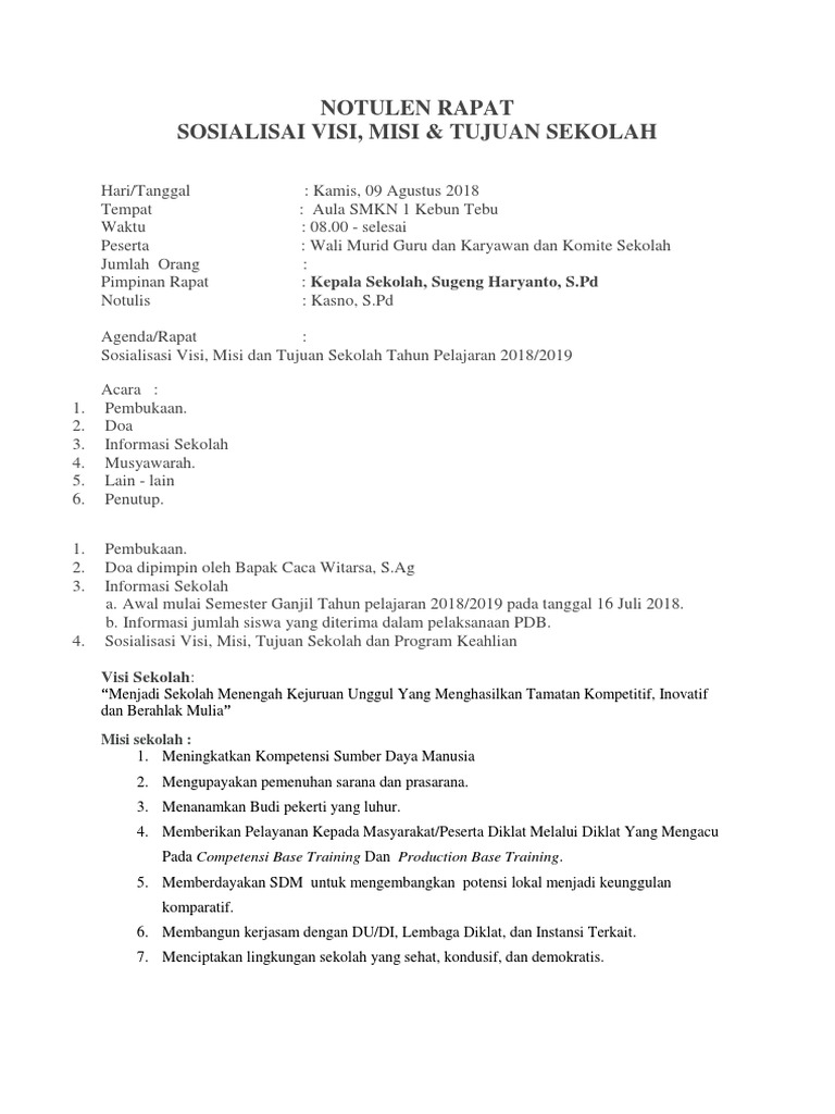 Berita acara notulen dan daftar hadir ini saya bagikan sebagai bahan untuk bukti fisik akreditasi standar pengelolaan khususnya. Visi misi menjadi arah bagi sekolah kedepannya ingin seperti apa. Menanamkan keimanan dan ketakwaan melalui pengamalan ajaran agama. Berikut ini contoh berita acara penyusunan visi misi dan tujuan sekolah.