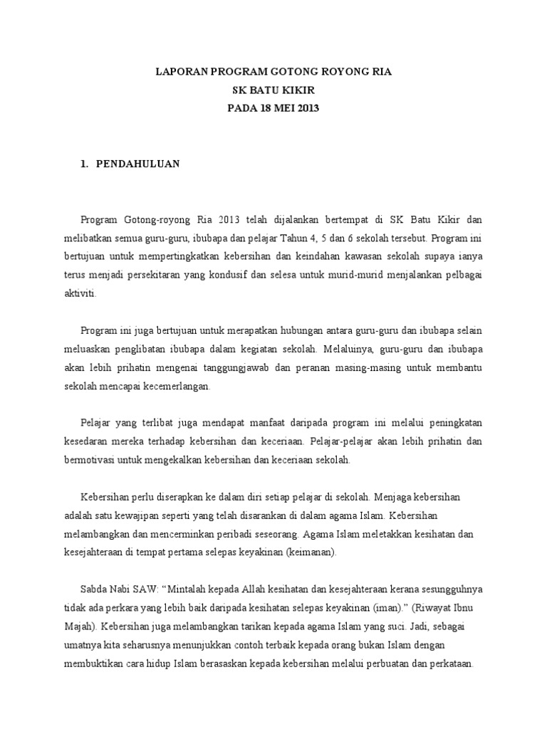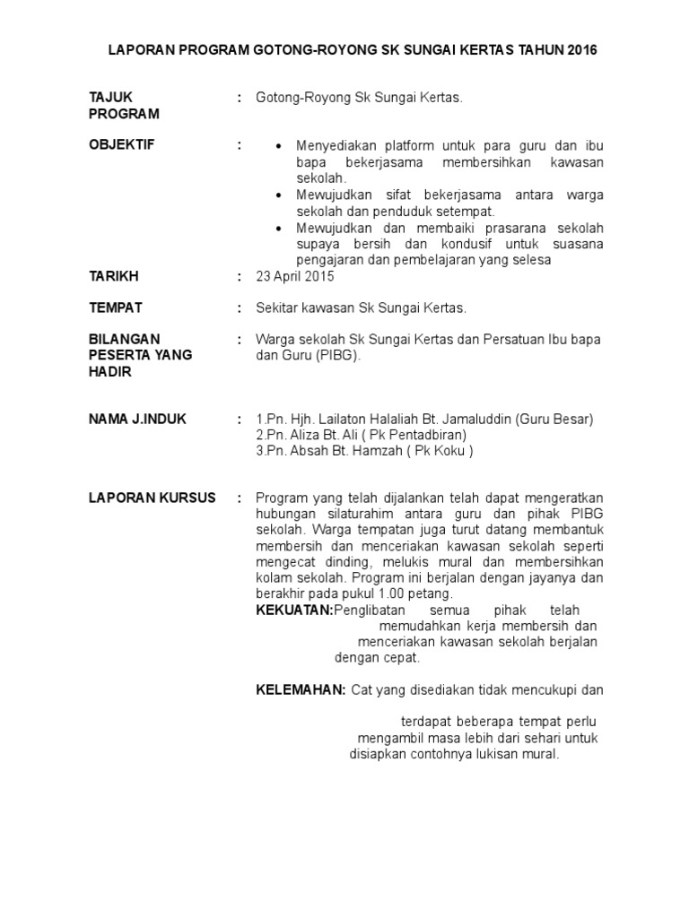 Contoh laporan aktiviti gotong royong. Posting pada s1 s2 s3 sd sma smk smp umum ditag 3 contoh manfaat gotong royong apa saja manfaat gotong royong mikirbae apa yang dimaksud dengan negara gotong royong apakah perlu bergotong royong arti kata tercemar arti kerja bakti artikel tentang gotong royong di desa berita gotong royong budaya gotong royong jurnal cara mengajak masyarakat bergotong royong cerita gotong. Admin blog seputar laporan 2019 juga mengumpulkan gambar gambar lainnya terkait contoh laporan aktiviti gotong royong dibawah ini. Gotong royong dimulakan dengan aktiviti membersihkan dan mengutip sampah sarap yang dijumpai pada zon yang telah ditetapkan. Selepas itu semua guru dan murid murid ke kantin untuk rehat dan sarapan pagi.