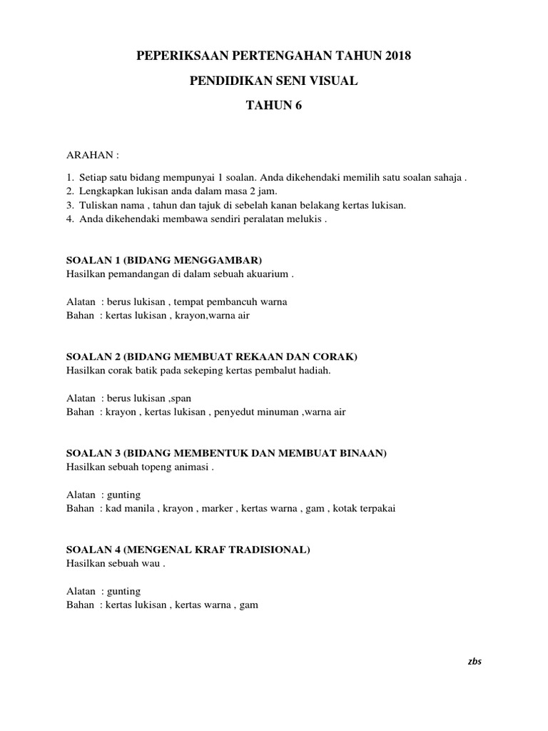 Contoh kertas peperiksaan spm 49 contoh kertas soalan spm 34 skema jawapan 33 tips 32 pmr 30 2010 26 bahasa melayu 25 kertas peperiksaan spm 25 karangan 24 bm 23 tips belajar 22 bank soalan pmr 20 contoh kertas soalan pmr 18 soalan dan skema jawapan 18 pendidikan seni visual 16 contoh kertas percubaan stpm 15. Soalan pendidikan seni visual soalan pendidikan seni visual tahun 4 arahan 1. Sebelum bermula cuti sekolah murid perlu melalui ujian peperiksaan terakhir iaitu peperiksaan akhir tahun yang menilai apa yang telah dipelajari oleh murid sepanjang setahun berada di sekolah. Berikut merupakan koleksi rph pendidikan seni visual tahun 6.