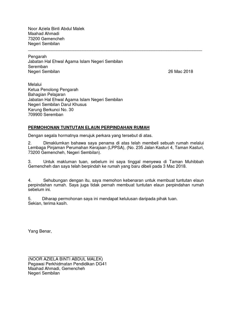 Contoh surat tuntutan elaun pindah rumah. Surat kelulusan pinjaman perumahan kerajaan 5 salinan sijil nikah 3 salinan kad pengenalan 3 salinan. 8 surat tawaran menduduki rumah kerajaan. Berikut adalah kadar elaun pindah rumah yang akan diterima mengikut gred dan status pekahwinan. Kadar elaun perpindahan rumah.