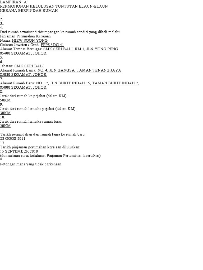 Borang tuntutan elaun perpindahan rumah lampiran a surat pengesahan alamat rumah yang dibeli di bawah skim pinjaman perumahan kerajaan lampiran b borang akuan keluar kuarters lampiran c surat kelulusan pinjaman perumahan perbendaharaan. Tuntutan elaun perpindahan rumah mengikut surat p ekeliling perkhidmatan bil 10 1989 pekeliling perkhidmatan bil 9 1991 dan pekeliling perbendaharaan bil 4 1995 meruiuk kepada perk ara di atas saya memohon kelulusan untuk membuat tuntutan elaun berpindah ke rumah sendiri yang dibeli melalui pinjaman perumahan kerajaan. Mungkin ada yang berpendapat elaun ini juga boleh dituntut jika dapat perpindahan yang dimohon atau ditetapkan. Urusan tuntutan elaun berpindah ke rumah yang dibeli melalui pinjaman kerajaan sertakan dokumen sokongan berikut yang telah disahkan oleh kj ku.