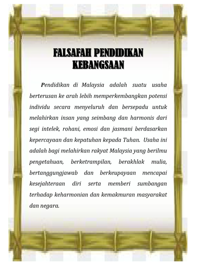 Falsafah pendidikan kebangsaan pendidikan di malaysia adalah suatu usaha berterusan ke arah memperkembangkan lagi potensi individu secara menyeluruh dan bersepadu untuk mewujudkan insan yang seimbang dan harmonis dari segi intelek rohani emosi dan jasmani berdasarkan kepercayaan dan kepatuhan kepada tuhan. Falsafah pendidikan kebangsaan pendidikan di malaysia adalah suatu usaha berterusan ke arah memperkembangkan lagi potensi individu secara menyeluruh dan bersepadu untuk mewujudkan insan yang seimbang dan harmonis dari segi intelek rohani emosi dan jasmani berdasarkan kepercayaan dan kepatuhan kepada tuhan. Dari sudut sejarah falsafah pendidikan negara lahir daripada proses yang agak panjang iaitu satu proses pembinaan bangsa dan negara malaysia semenjak merdeka lagi. Falsafah pendidikan yang menjadi panduan bagi semua aktiviti pendidikan di malaysia dekenali sebagai fpk.
