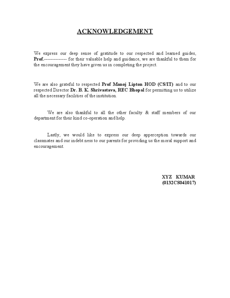 Final year project report acknowledgement. For example when writing an acknowledgement for a student final year project paper the people you will mention in your acknowledgement will be different from the people you will mention when writing a research paper etc. Try to avoid personal thoughts which aren t appropriate especially if the document deals with a very technical subject. This is an example on how to write a good acknowledgement for any projects i e. Here are sample acknowledgments that you can include in your school college icse ssc project report.