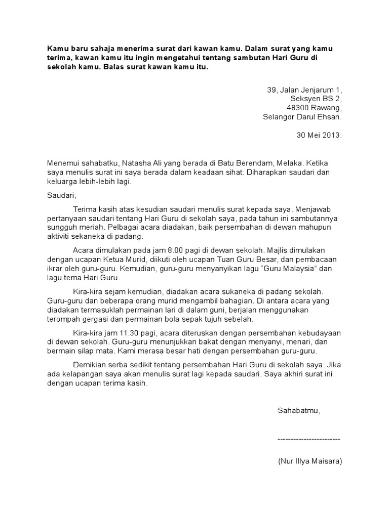 Karangan surat tidak rasmi surat tidak rasmi kepada rakan contoh surat tidak rasmi kepada kawan contoh surat tidak rasmi upsr surat tidak hadir ke sekolah contoh surat tidak rasmi surat tidak hadir kuliah contoh surat tidak hadir. Sememangnya tidak perlu perkenalkan diri sebab sudah diperkenalkan di nama dan alamat di atasnya. Related posts to contoh karangan surat tidak rasmi format pt3 contoh karangan surat tidak rasmi format pt3 2019 10 26t17 00 00 07 00 rating. Surat kiriman tidak rasmi merupakan surat surat peribadi yang biasanya ditulis kepada ahli keluarga sahabat guru penjaga dan sebagainya.