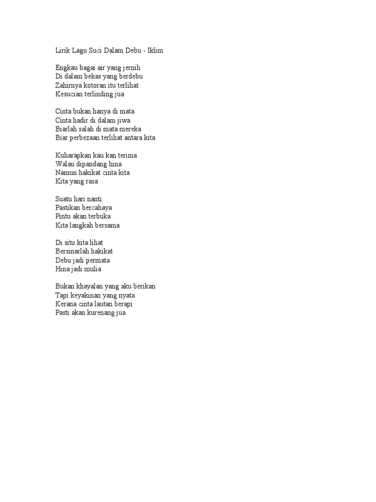 Suci dalam debu lyrics. Cinta bukan hanya di mata. Dan satu kesan paling abadi yang muncul beberapa singgel album hit di antaranya suci dalam debu pada tahun 1991 1992 dan masih banyak lirik lagu selain dari lirik lagu yang berjudul suci dalam debu di blog lirikindonesia id yang sedang populer sekarang ini diantaranya yang sedang populer sekarang ini diantaranya. Tabloidbintang com lagu suci dalam debu yang dinyanyikan grup iklim termasuk salah satu lagu malaysia yang sangat populer di indonesia di akhir 80 an sampai awal 90 an banyak grup band asal malaysia yang berjaya di indonesia dan iklim salah satunya.