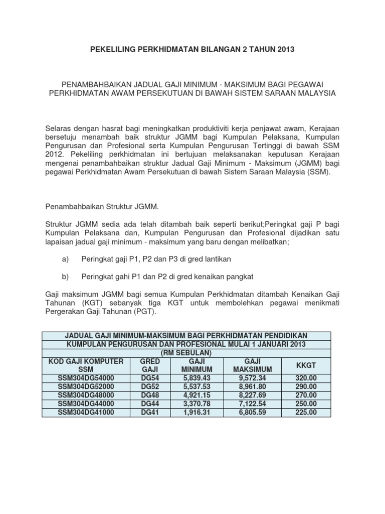 Indeks jadual gaji minimum maksimum perkhidmatan awam malaysia khas untuk penyandang 63 4. Pekeliling ini bertujuan untuk memaklumkan penambahbaikan jadual gaji minimum maksimum jgmm gred 1 hingga gred 54 di bawah sistem saraan malaysia ssm latar belakang kerajaan malaysia melalui pekeliling perkhidmatan bilangan 36 tahun 2013 telah melaksanakan penambahbaikan jadual gaji minimum maksimum jgmm gred 1 hingga. Posted by unknown at 04 22. 2 tahun 2013.