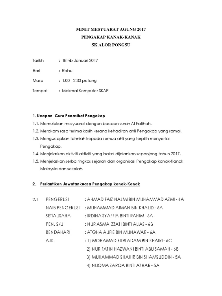 Agenda mesyuarat dan contoh lengkap catatan minit mesyuarat panitia sejarah sherly jewinly 950922 12 6662 3 pismp rbt ipg kampus pendidikan teknik 2. 3 1 ucapan pengerusi presiden 3 2 pengesahan minit mesyuarat agung tahunan yang lepas 3 3 perbentangan pengesahan laporan aktiviti tahunan persatuan 3 4 pembentangan pengesahan laporan kewangan persatuan. Tuan pengerusi penaja encik badrul isham bajuri mengalu alukan kehadiran ahli ahli ke mesyuarat. 1 1 pengerusi memulakan mesyuarat dengan ucapan terima kasih kepada ahli exco kerana dapat hadir ke mesyuarat pertama exco kksr sesi 2011 2013.