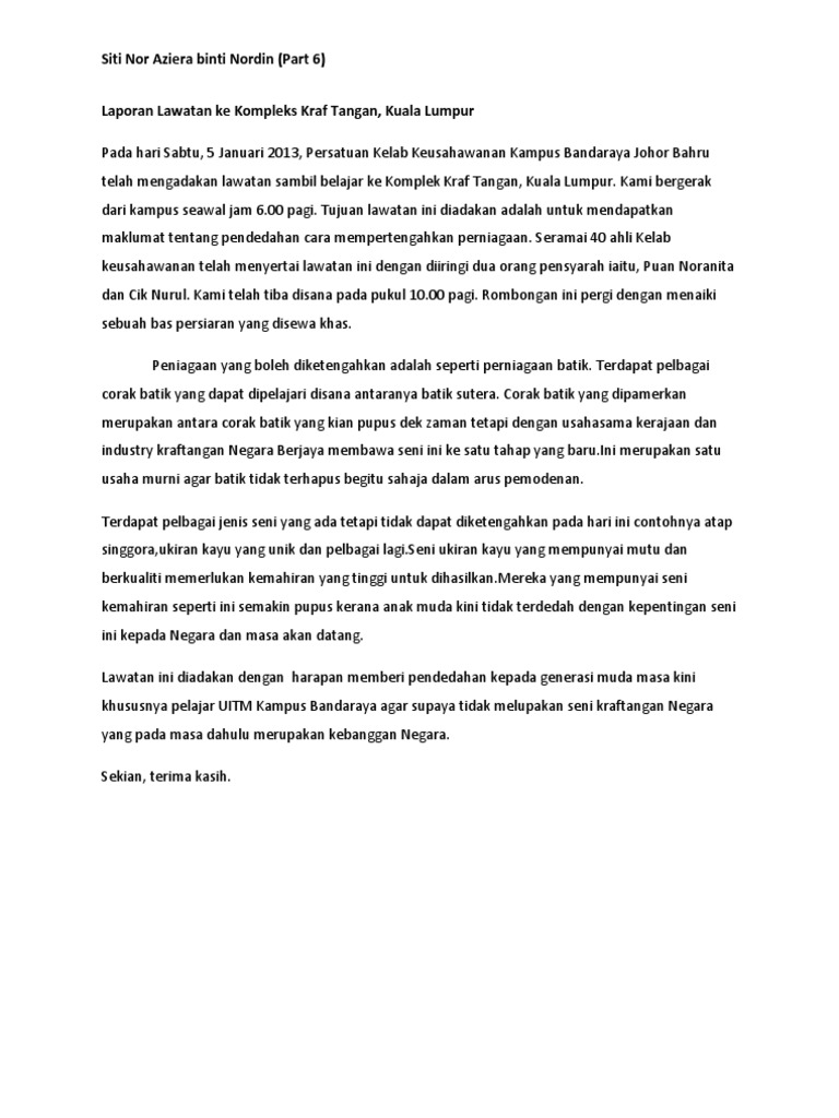 Karangan laporan laporan lawatan sambil belajar laporan contoh soalan. Pada 20 jun yang lalu sekloah jenis sekolah kebangsaan jalan satu menganjurkan lawatan sambil belajar ke kilang batik yang. Persatuan bahasa malaysia sekolah kamu telah mengadakan lawatan sambil belajar ke sebuah kilang batik. Laporan lawatan sambil belajar pada 3 november 2016 yang lalu persatuan bahasa melayu sekolah kebangsaan bukit harimau telah mengadakan satu lawatan sambil belajar ke kilang batik warisan yang terletak di kawasan perindustrian shah alam.