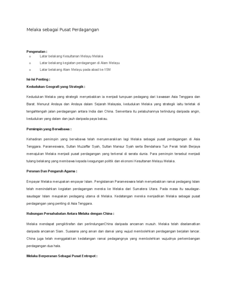 About contact dkm1c. Pusat perdagangan dan dakwah perdagangan telah menjadi nadi yang mewujudkan kemakmuran ekonomi kepada kerajaan melaka. Kegemilangan dan kemakmuran melaka telah menarik portugis untuk datang dan seterusnya menguasai melaka. Kegemilangan melaka dalam bidang perdagangan telah dinyatakan dalam buku sejarah melayu iaitu.