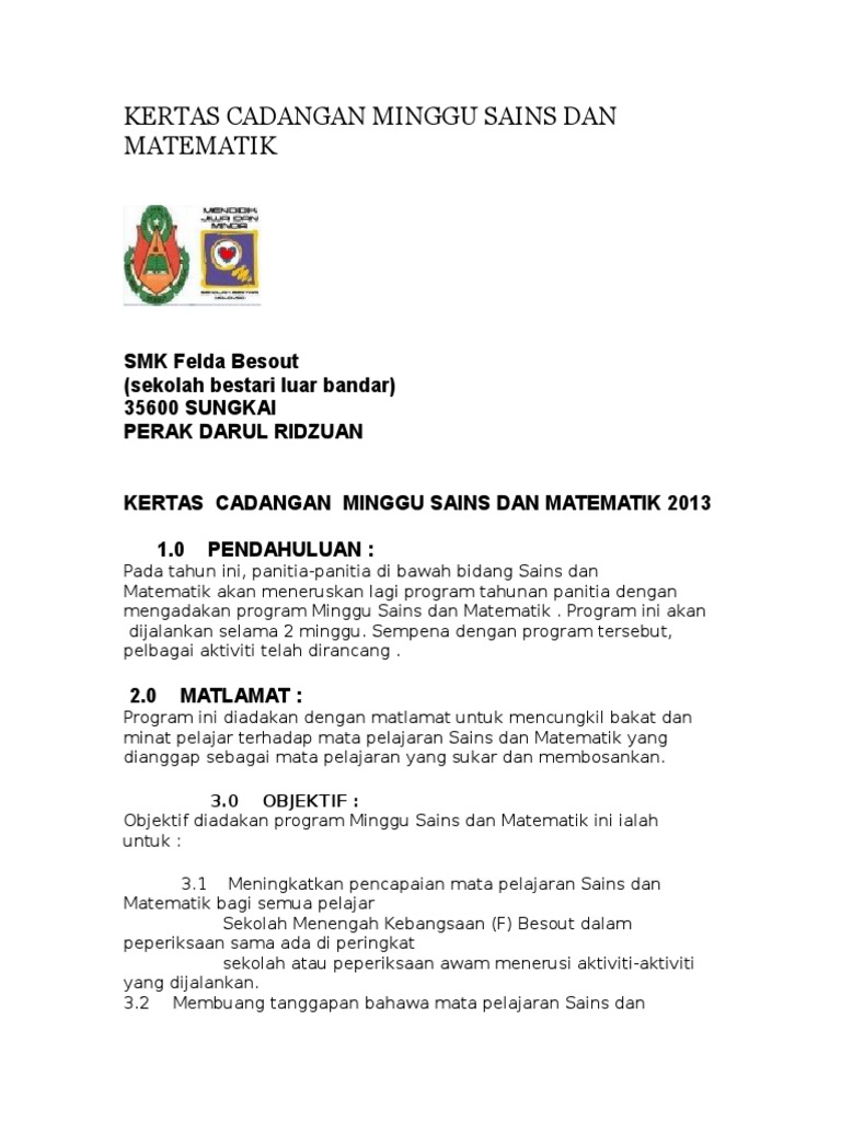 Banyak juga aktiviti yang dah dirancangkan. Kertas cadangan minggu sains dan matematik 2013 1 0 pendahuluan. Kertas kerja program inovasi sekolah 2011 kertas kerja perancangan program pembangunan. Antara program yang wajib dilakukan hampir setiap sekolah adalah program melibatkan panitia sains dan matematik.