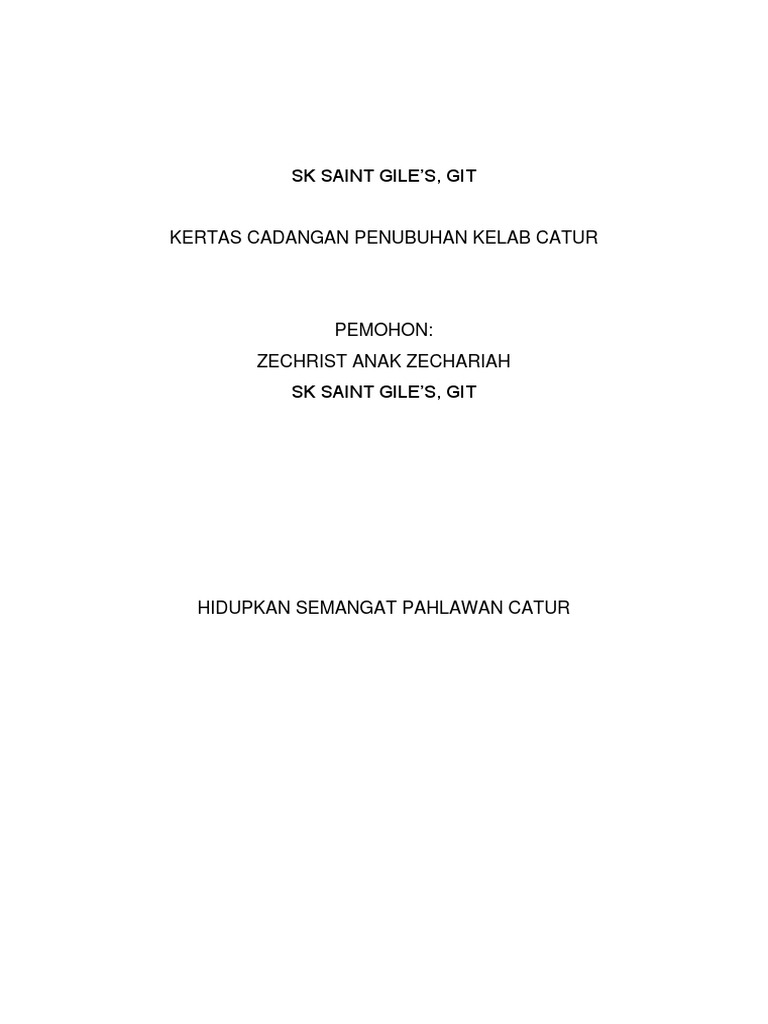 Kertas kerja penubuhan kelab catur. Cuma isi kandungan berbeza. Pembinaan persekitaran bilik darjah yang mesra budaya. Kertas kerja pertandingan catur peringkat sekolah pengenalan acara catur ialah satu acara tetap yang berlangsung setiap tahun bagi memilih pemain catur yang akan mewakili sekolah ke kejohanan catur daerah. Penubuhan pembimbing rakan sebaya prs sekolah kebangsaan saint martin merdang samarahan.