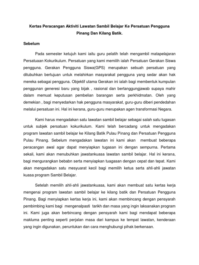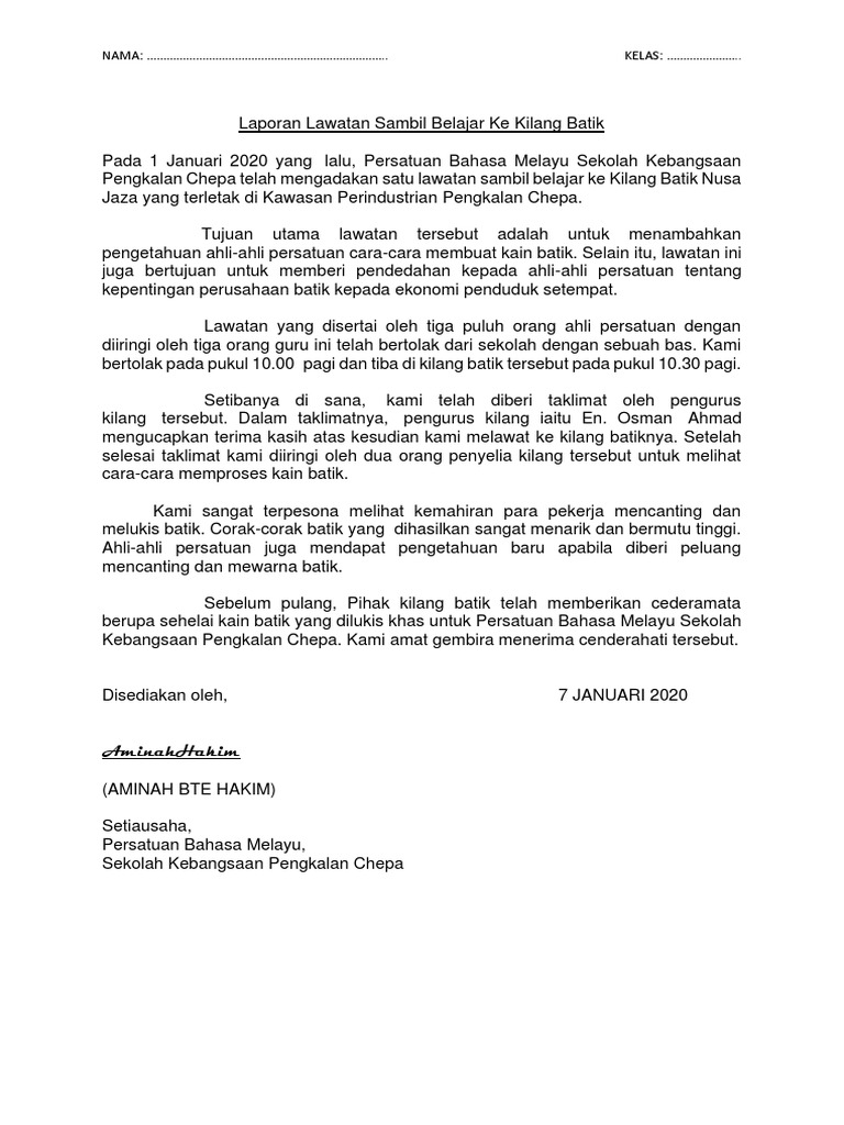 Lawatan sambil belajar ke kilang batik. Sediakan laporan itu selengkapnya. Laporan lawatan ke kilang batik seri kampung pada hari sabtu yang lalu persatuan kajian tempatan sekolah kebangsaan permai jaya telah mengadakan lawatan ke kilang batik seri kampung sibu. Kamu sebagai setiausaha persatuan diminta untuk meyediakan laporan tentang lawatan tersebut. Secara keseluruhannya lawatan ke pantai timur ini telah memberi banyak impak positif kepada kami.