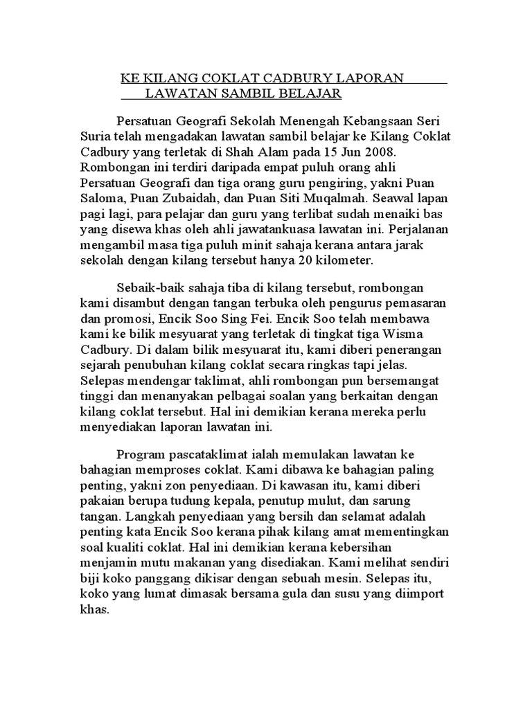 Lawatan ini turut diiringi oleh dua orang pensyarah iaitu pn asma dan pn. Aktiviti lawatan sambil belajar telah di adakan di kilang beryl s chocolate sri kembangan pada 28 april 2018 sabtu. Kertas kerja lawatan sambil belajar ke kilang coklat koleksi kaji semula kertas kerja lawatan sambil belajar ke kilang coklat 2020 gambar. Persatuan geografi sekolah menengah kebangsaan seri suria telah mengadakan lawatan sambil belajar ke kilang coklat cadbury yang terletak di shah alam pada 15 jun 2008.