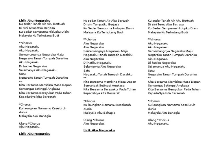 Maksud lirik lagu aku negaraku. Intro ooh ooh ooh ooh ooh ooh ooh verse 1 allami ullyeodae ring ring a ling seoloui nungili daheul ttaemada. Ku sedar sempurna hidupku di sini. Lagu ini merupakan lagu patriotik terbaru di negara kita sepertimana diperkenalkan oleh perdana menteri malaysia menerusi laman sosial facebooknya najib razak. Negaraku tanah tumpahnya darahku rakyat hidup bersatu maju rakyat daripada pelbagai kaum agama bersatu padu berkorban untuk negara di bumi malaysia tempat kita dilahirkan berjuang hingga ke akhir hayat rahmat bahagia tuhan kurniakan lagu kebangsaan malaysia setiap rakyat.