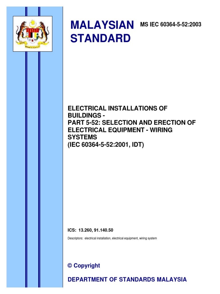 7 3 wherever in this specifications any propr ietary goods or materials are specified goods. Electrical interference with government signalling lines 47. Regulations for the installation of electrical wiring electrical equipment and air conditioning equipment. Electrical installations of buildings guide to ms iec 60364.