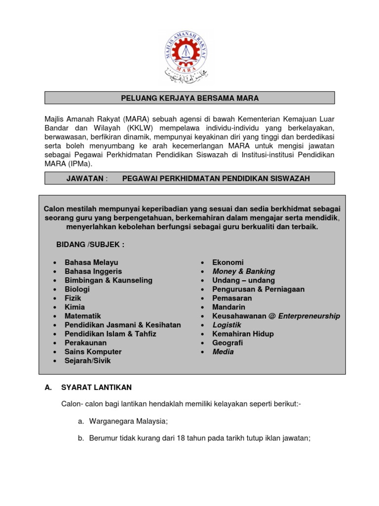 Bidang subjek bahasa melayu bahasa inggeris bimbingan kaunseling biologi. Majlis amanah rakyat mara sebuah agensi kementerian pembangunan luar bandar ditubuhkan pada 1 mac 1966 di bawah akta parlimen sebagai sebuah badan berkanun hasil daripada resolusi kongres ekonomi bumiputera pertama pada tahun sebelumnya. Adalah menjadi kewajipan majlis bagi memajukan menggalakkan memudahkan serta menjalankan pembangunan ekonomi dan kemasyarakatan dalam persekutuan dan. Pengurusan dan profesional pelaksana skim perkhidmatan bersepadu klasifikasi.