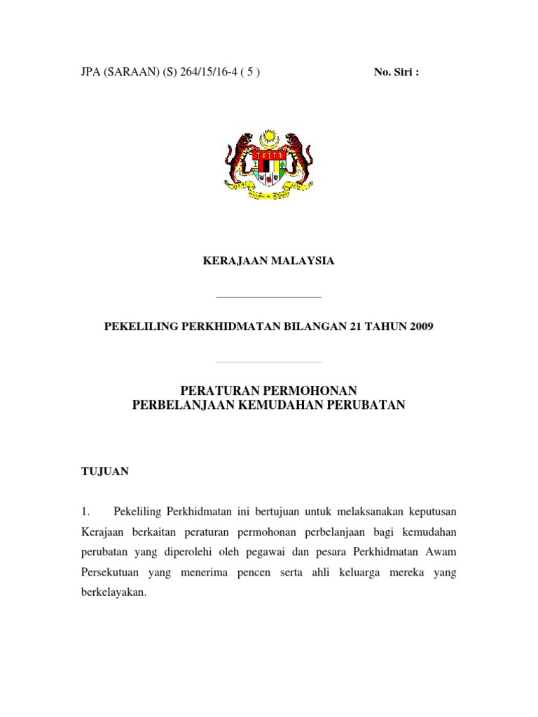 Maklumat hendaklah dilengkapkan dengan jelas dan menggunakan huruf besar. Pekeliling perkhidmatan bilangan 1 tahun 1993 spp bil. Peraturan sebagaimana yang ditetapkan dalam perintah am bab f tahun 1974 dan pekeliling perkhidmatan bilangan 21 tahun 2009. Berkaitan itu permohonan perbelanjaan bagi maksud kemudahan perubatan yang diperolehi sebanyak rm adalah diluluskan tidak diluluskan.