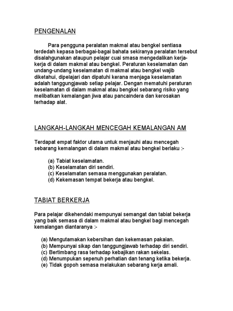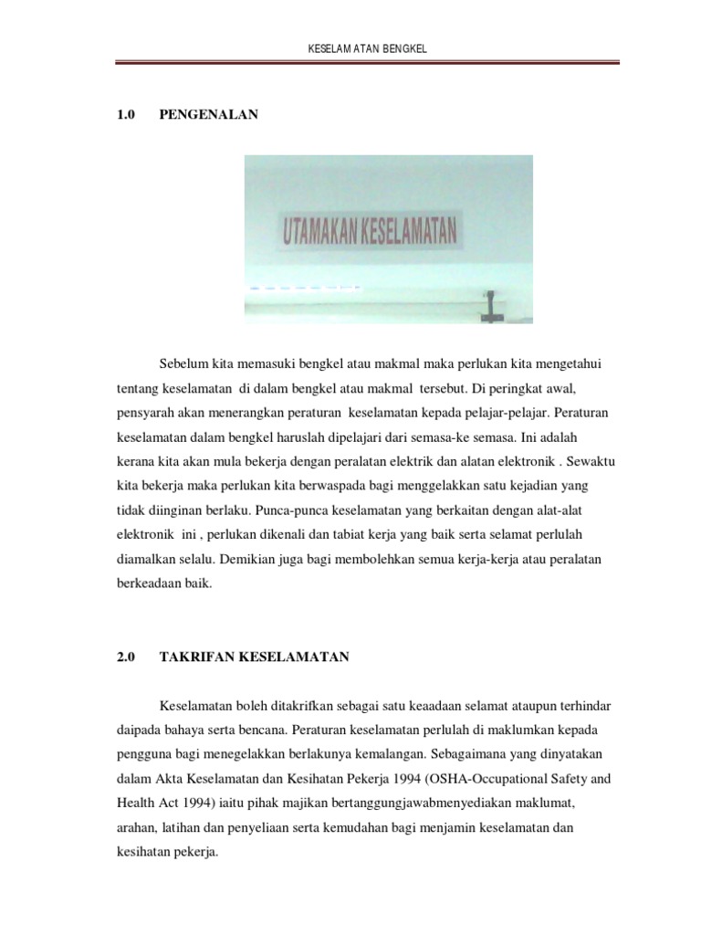 Pengenalan keselamatan di bengkel. Sebelum kita memasuki bengkel atau makmal maka perlukan kita mengetahui tentang keselamatan di dalam bengkel atau makmal tersebut. Di dunia industry modern biasanya dibuat sistem keselamatan kerja dengan membuat aturan aturan atau tata cara pengoperasian alat serta mesin perbengkelan. 1 1 pengenalan keselamatan boleh ditakrifkan sebagai satu keadaan selamat ataupun terhindar daripada bahaya serta bencana. Pengurusan dan keselamatan bengkel 1.