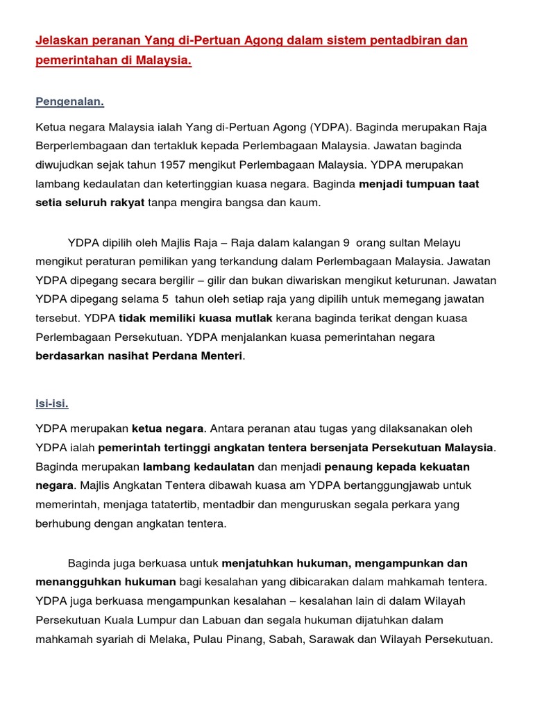 Ydpa adalah simbol keunikan sistem pemerintahan beraja berpelembagaan yang diamalkan di negara kita sejak mencapai kemerdekaan sehingga hari ini. Peralihan kerajaan itu menyaksikan sultan muhammad v mencatat sejarah tersendiri dengan menjadi yang di pertuan agong malaysia yang pertama memerintah dalam era dua kerajaan berbeza. Peranan umum yang di pertuan agong ydpa peranan ydpa adalah berdasarkan konsep raja berpelembagaan. Sebagai negara yang mengamalkan sistem raja berperlembagaan peranan yang di pertuan agong adalah meluas tetapi dalam masa yang masa masih lagi tertakluk kepada perlembagaan persekutuan.