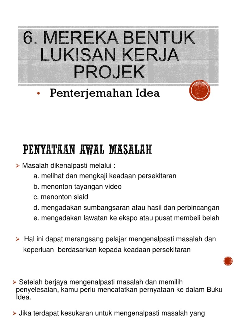 Pernyataan masalah masalah yang dinyatakan perlu menunjukkan situasi bermasalah dan individu berkeperluan yang terlibat. Teliti semua lakaran reka bentuk projek dan pilih satu idea reka bentuk terbaik. Pelajar boleh menyesuaikan diri dengan perubahan dan perkembangan teknologi semasa dan menjadi penyumbang kepada pembangunan teknologi negara melalui penghasilan sesuatu reka cipta. Menyediakan projek reka cipta.