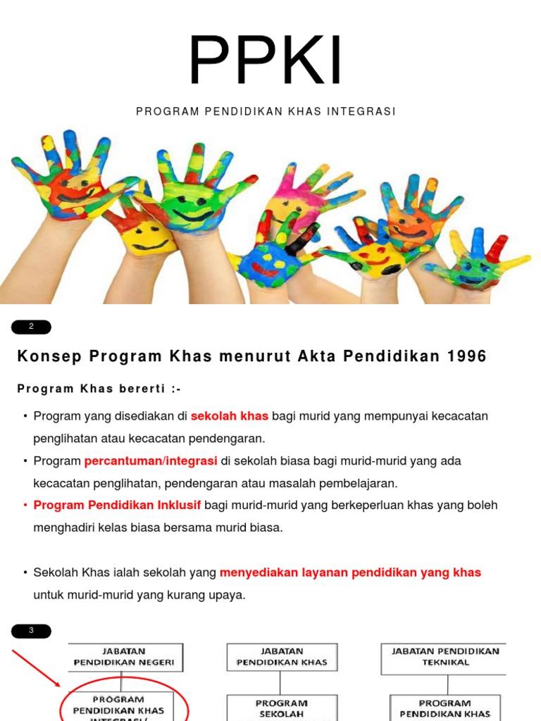 Program pendidikan khas integrasi sk tampin 73000 tampin negeri sembilan. Tujuan program pendidikan khas integrasi semua murid berkeperluan pendidikan khas mbk berpeluang untuk menerima akses pendidikan yang releven dan sesuai semua mbk perlu diperkembangkan bakat dan potensi murid melalui pendidikan vokasional bagi menghasilkan insan yang berkemahiran ke arah meningkatkan kualiti hidup. Ditubuhkan pada 1 oktober 1995 bertanggungjawab untuk. Program pendidikan khas untuk murid berkeperluan khas dari segi menghadapi masalah penglihatan dan masalah pendengaran pendidikan khas masalah pembelajaran tujuan program pendidikan khas integrasi ppki adalah untuk mendidik murid murid yang secara fizikalnya normal tetapi lemah dalam pembelajaran lembam.