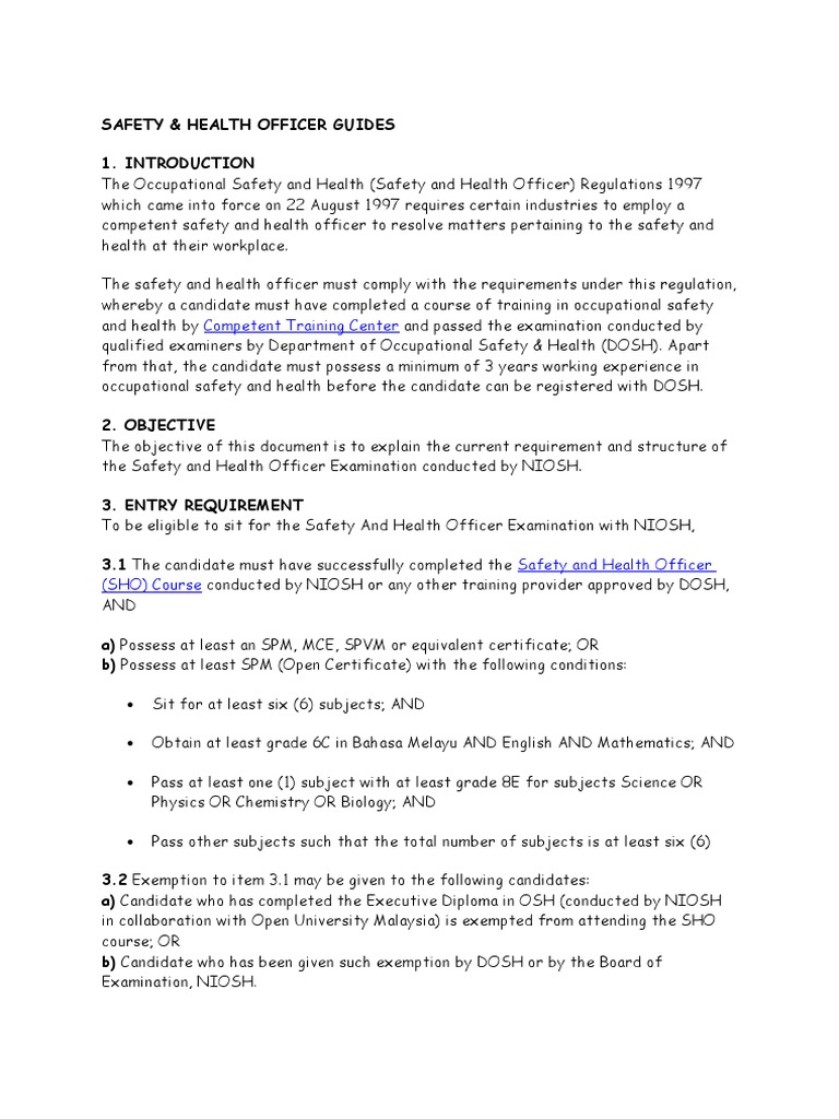 To be eligible to sit for the safety and health officer examination with niosh the candidate must have successfully completed the safety and health officer sho course conducted by niosh or any other training provider approved by dosh and.