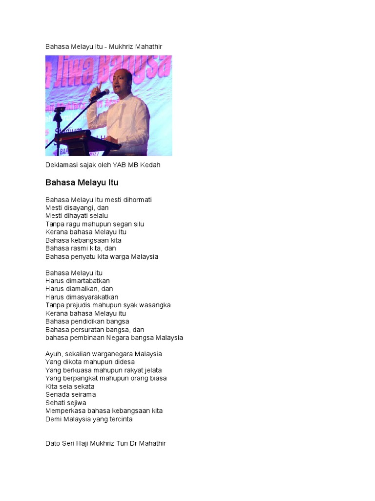 Antara pemimpin yang terpenting ialah usman awang. Sebenarnya bahasa melayu dipinggirkan oleh bangsanya sendiri sama ada secara sedar ataupun tidak. Cintailah bahasa kita bahasa malaysia bahasa melayu merupakan bahasa kebangsaan dan bahasa rasmi negara. Sajak adalah salah satu bentuk karya sastra yang tidak terikat dengan aturan.
