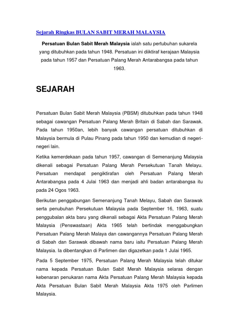 Sejarah bulan sabit merah malaysia. Sejarah bulan sabit malaysia telah bermula sejak era penjajahan british lagi iaitu selepas perang dunia ke 2. 2 pada bulan november 1876 turki yang sedang berperang dengan russiaselama enam bulan tiba tiba mengumumkan kepada majlis persekutuanswiss sebagai penjaga konvensyen geneva bahawa lambang palang merahmenghina kepercayaan agama anggota anggota tenteranya dan oleh yangdemikian mereka akan menggunakan lambang bulan sabit merah untukperkhidmatan ambulans mereka. Palang merah telah pun wujud di persekutuan tanah melayu di bawah penjajahan british sebagai a branch of the british red cross. Persatuan bulan sabit merah malaysia pbsm adalah satu pertubuhan sukarela yang ditubuhkan pada tahun 1948.
