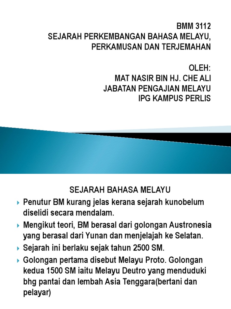 Gerini mengatakan melayu berasal. Projek ini dilaksanakan bagi menelusuri sejarah perkembangan bahasa melayu melalui naskhah lama dan bagi mengetengahkan hasil kajian yang berkaitan dengan bahasa persuratan dan kebudayaan melayu di alam melayu iaitu daerah yang mewarisi tradisi tamadun melayu. Sejarah bahasa indonesia bahasa indonesia dikenal sebagai bahasa melayu yang dalam perkembangannya mulai digunakan sebagai bahasa resmi dari bangsa indonesia dan juga dikenal sebagai bentuk bahasa pemersatu bangsa. Ptolemy menggunakan istilah maleu kolon dalam geographike sintaxis sekitar 100 150m.