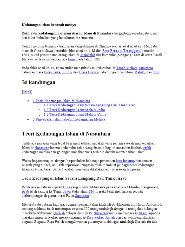 Sejarah kedatangan islam ke tanah melayu pdf. Beliau menyebut yang dimaksudkan dengan alam melayu ialah dari semenanjung tanah melayu sumatera jawa kalimantan sulawesi dari pulau pulau nusantara. Karena koversi melayu terjadi terutama selama periode kesultanan malaka pada abad ke 15 m dari sekitar tahun 1402 hingga 1511 m. Tindakan parameswara menganut agama islam pada tahun 1414 masehi dengan gelaran megat iskandar shah telah merancakkan. Nurul huda binti ab ghani.