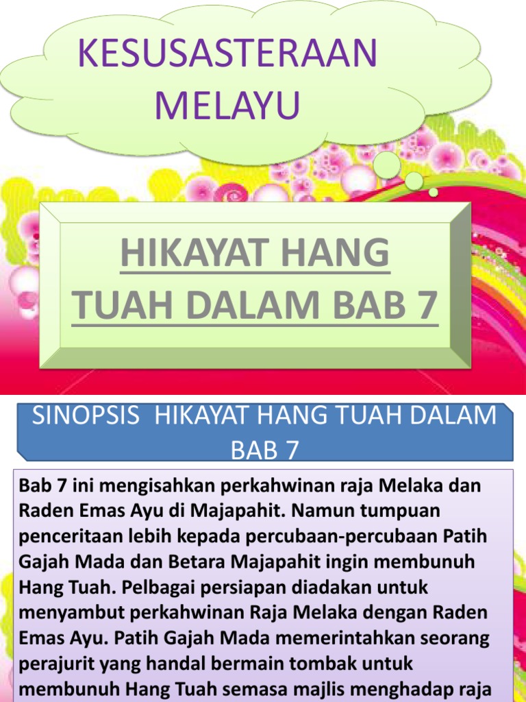 Sinopsis hikayat hang tuah bab vii. Latar tempat di majapahit. Hanya hang tuah seorang sahaja yang diberi ilmu yang lebih dari rakan rakannya kerana hang tuah ini bukannya sembarangan orang. Radin mas ayu adalah anak kepada betara majapahit. Hang tuah merupakan seorang hamba yang perlu mempunyai raja untuk mengabdikan kesetiaan dan ketaatannya.
