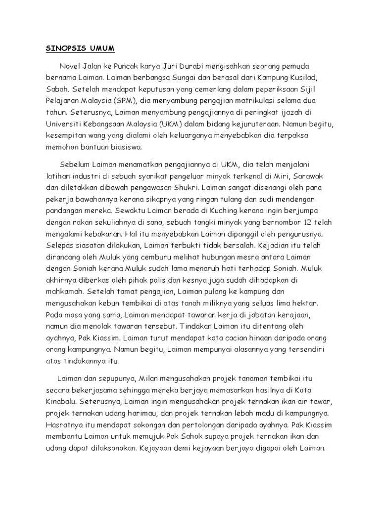 Semoga perkongsian nota nota rujukan bahasa melayu contoh contoh karangan bahan bahan pembelajaran dan pengajaran. Farhani kebasahan dan sesekali menggigil kesejukan akibat. Novel jalan ke puncak merupakan novel telah dipilih menjadi rujukan komsas tingkatan 2 yang mula digunakan pada tahun 2016 novel ini adalah hasil karya juri durabi juri durabi si oyong atau kini dikenali dengan nama juri durabi seorang penulis yang telah menghasilkan banyak karya seperti novel susuk tingkayu jalan ke puncak misteru gua gumantong gadis atlit benih harapan dia yang dilupakan. Terdapat 15 bab semuanya.