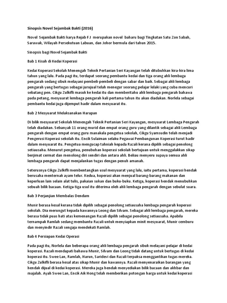 Sinopsis ringkas novel sejambak bakti tingkatan 1. Sinopsis novel sejambak bakti novel ini mengisahkan usaha murid dan guru koperasi sekolah menengah teknik pertanian seri kayangan untuk membangunkan koperasi sekolah mereka. Sejambak bakti persoalan tingkatan 1. Sinopsis novel tingkatan 1 2015 sejambak bakti sinopsis sejambak bakti tingkatan 1 2015 2014 17 september 1 august 3 april 8 february 2 january 3 2013 5 september 4 april 1. Terdapat banyak pengajaran yang diperoleh dalam novel ini.