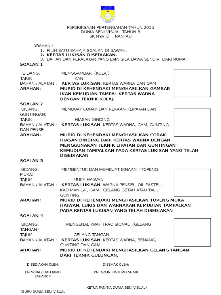 Oleh sebab itu pihak admin cuba bertungkus lumus mendapatkan stok stok soalan upt ini bagi membantu para guru ibubapa dan murid murid membuat persediaan untuk menghadapinya nanti. Soalan pendidikan seni visual psv tidak punyai penentuan format yang tetap. Peperiksaan akhir tahun dunia seni visual tahun 3 sesi persekolahan semakin sampai ke penghujungnya. Bank soalan peperiksaan akhir tahun tahun 3 adalah antara himpunan soalan soalan yang berjaya kami sediakan untuk menjadi panduan dan rujukan kepada guru dan pelajar.