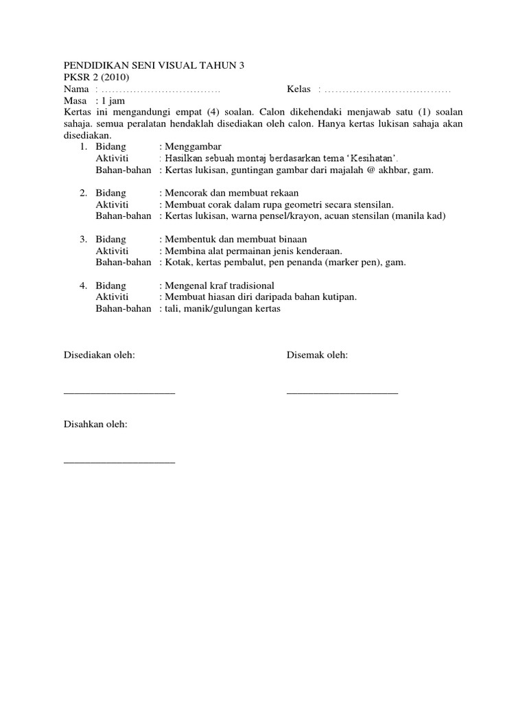 Soalan pendidikan seni visual tahun 3. Calon wajib menduduki semua kertas peperiksaan bagi mata pelajaran yang didaftar calon yang tidak dapat menduduki mana mana kertas peperiksaan bertulis atau melaksanakan ujian lisan khusus calon persendirian akan dianggap tidak hadir bagi mata pelajaran berkenaan. Kepada ibu bapa guru guru dan pelajar yang terlibat bolehlah merujuk kepada kalendar sekolah yang berkenaan untuk memastikan. Kertas soalan peperiksaan percubaan pendidikan seni visual psv spm 2019 skema jawapan. Sebelum bermula cuti sekolah murid perlu melalui ujian peperiksaan terakhir iaitu peperiksaan akhir tahun yang menilai apa yang telah dipelajari oleh murid sepanjang setahun berada di sekolah.