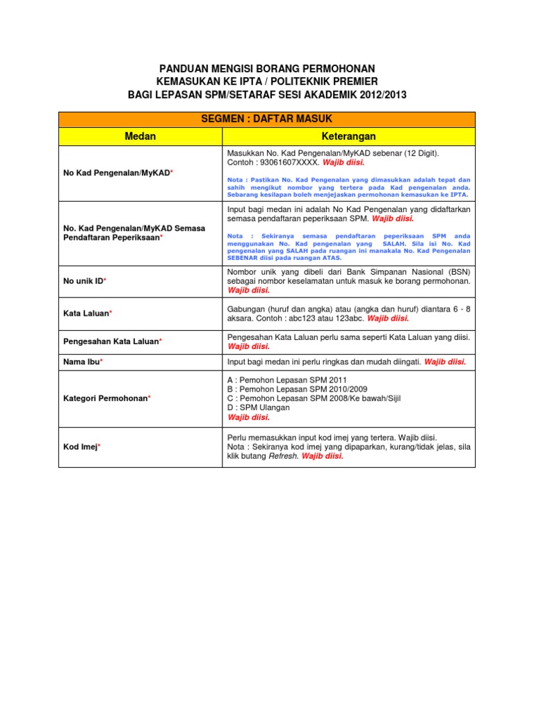 Kategori c pemohon yang menggunakan keputusan spm atau sijil yang setaraf dan diiktiraf oleh ipta. Calon yang memohon dengan keputusan spm dua tahun sebelum ini dengan sijil ulangan spm pada tahun ini atau calon yang memohon dengan keputusan spm satu tahun sebelum ini dengan sijil ulangan spm pada tahun ini atau calon yang memohon dengan keputusan spm dua tahun sebelum ini dengan sijil ulangan spm pada satu tahun sebelum ini 2 daftar masuk universiti awam dan politeknik. Ianya boleh dijadikan panduan dan rujukan bagi pelajar yang ingin membuat permohonan untuk ke peringkat pengajian tinggi. Terdapat dua bahagian kategori permohonan kepada pelajar pelajar yang mempunyai kelayakan spm setaraf dan stpm setaraf.