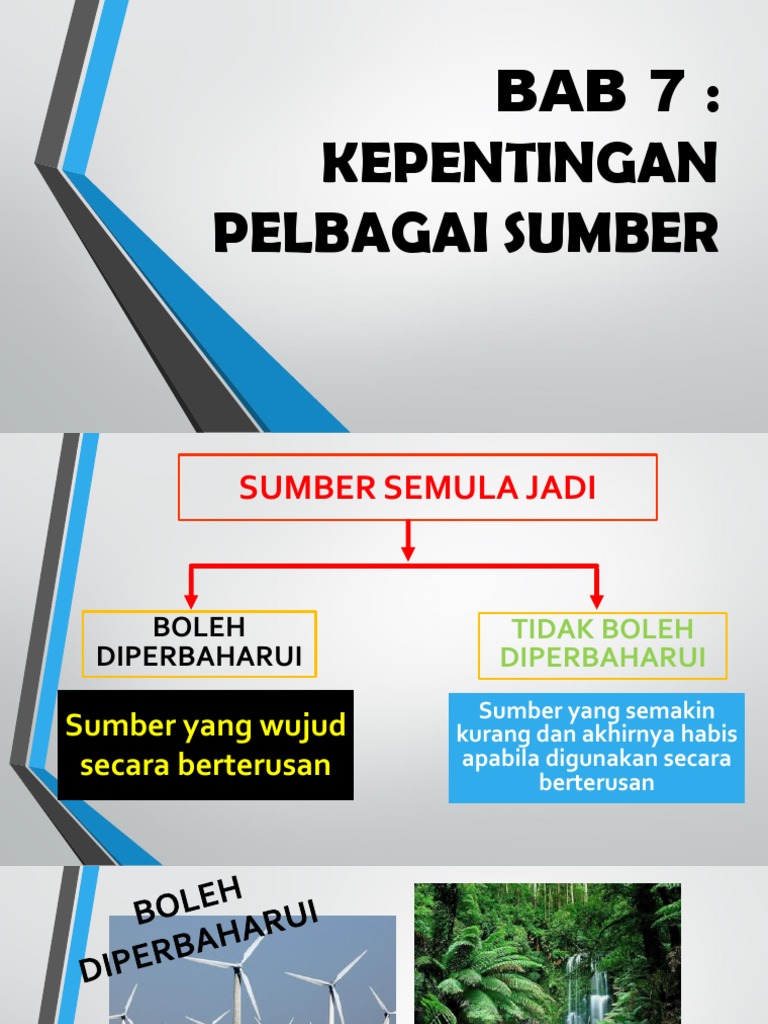 Sumber tenaga di muka bumi ini boleh dikelaskan kepada dua jenis iaitu sumber tenaga yang boleh diperbaharui dan sumber tenaga yang tidak boleh diperbaharui. Contoh contoh gambar sumber yang tidak boleh diperbaharui sumber yang diperbaharui 3. Sumber yang boleh diperbaharui dianggap sebagai sumber semula jadi yang dapat menghasilkan semula secara semula jadi dengan kelajuan yang lebih tinggi daripada penggunaannya oleh manusia. Sumber semula jadi yang boleh diperbaharui dan tidak boleh diperbaharui sumber semula jadi diklasifikasikan sebagai boleh diperbaharui dan tidak boleh diperbaharui mengikut kemampuan atau kemungkinan bahawa mereka dapat tumbuh semula secara semula jadi pada kadar yang lebih tinggi daripada penggunaannya.