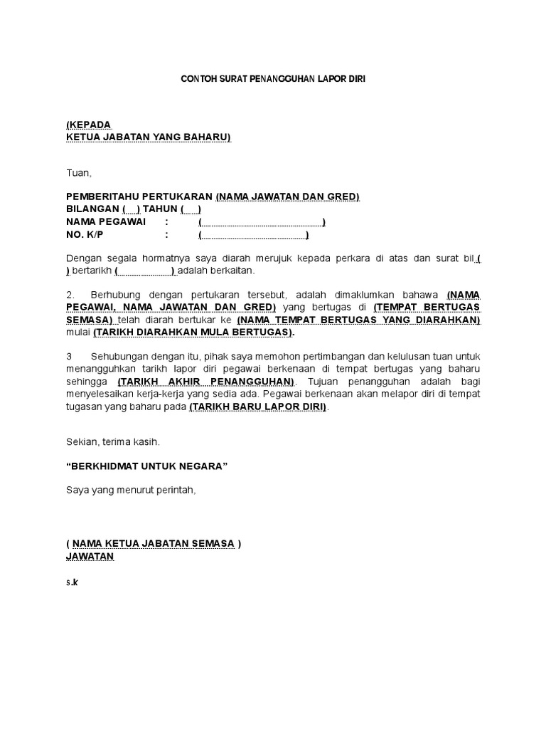 Surat mohon tangguh lapor diri. Contoh surat makluman latihan murid dan raptai su. Memandangkan ada di kalangan kita yang telah berjaya dalam proses permohonan egtukar namun memerlukan penangguhan untuk melapor diri atau memulakan tugas di sekolah baru. Tetapi anda mempunyai beberapa masalah yang memerlukan anda untuk tangguh dahulu tarikh lapor diri bertugas di tempat baru. Saya mengharapkan agar pihak tuan dapat mempertimbangkan perkara ini.