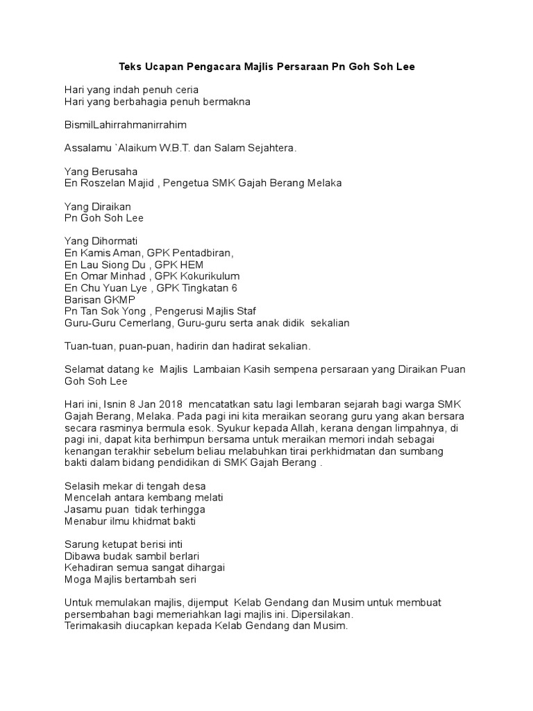 Contoh teks ucapan alu aluan dari presiden kelab permotoran ucapan alu aluan dari presiden cec. Teks pengacara majlis majlis kasih disemai bakti dituai sempena persaraan pn hjh noor hayati binti haji bakri pengetua smk sijangkang jaya 14 oktober 2010. Seterusnya tibalah waktu yang kita nanti nantikan iaitu ucapan daripada yang diraikan puan ku pisah ku ahmad. Teks ucapan majlis persaraan teks ucapan majlis apc teks ucapan majlis persaraan teks ucapan majlis graduasi teks ucapan majlis perpisahan teks ucapan majlis maulidur rasul teks ucapan majlis penyerahan slip spm teks ucapan perasmian teks ucapan perpisahan teks ucapan teks ucapan perasmian majlis teks ucapan mc teks ucapan aluan.
