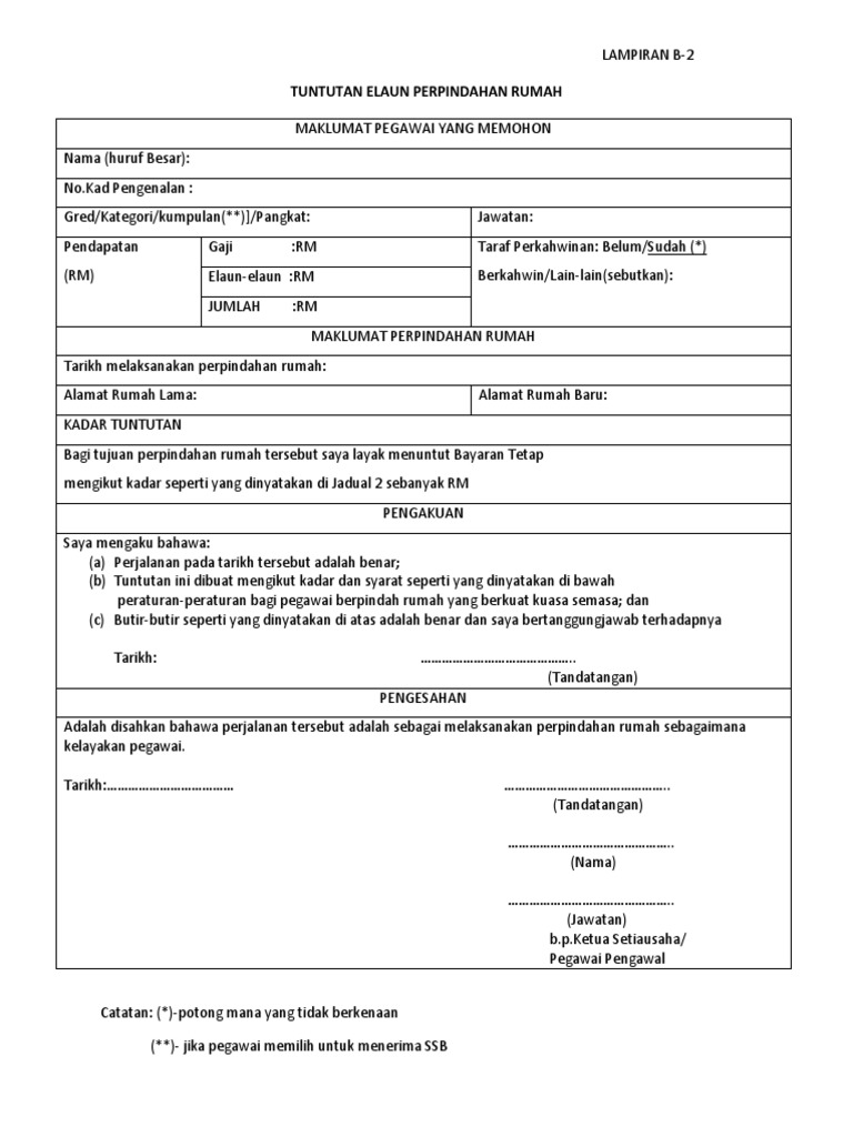 Borang tuntutan elaun perpindahan rumah lampiran b 2 2. Syarat permohonan tuntutan pindah rumah. Elaun ini sebenarnya adalah berbeza kerana tuntutan pindah rumah hanya untuk mereka yang berpindah rumah iaitu tidak boleh melebihi 25 km. Salinan sijil nikah surat pendaftaran perkahwinan diakui sah yang ni diperlukan sebab bagi yang dah berkahwin dan bujang kadar yang akan dibayar oleh jabatan adalah berlainan.